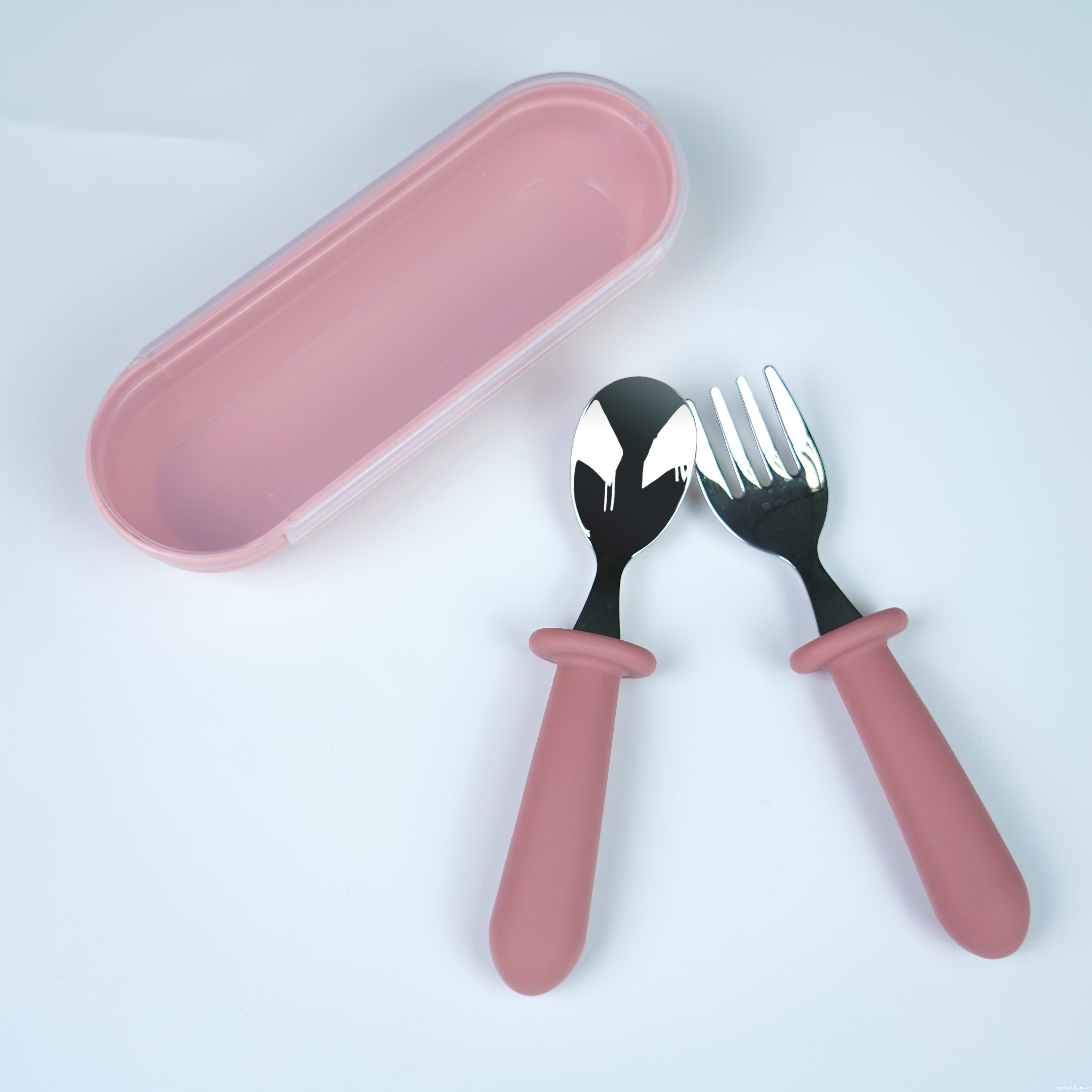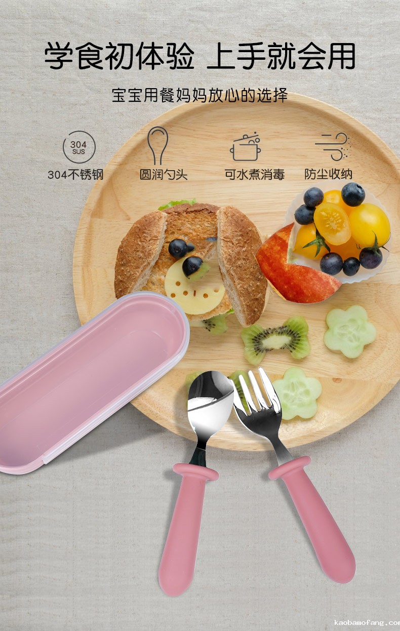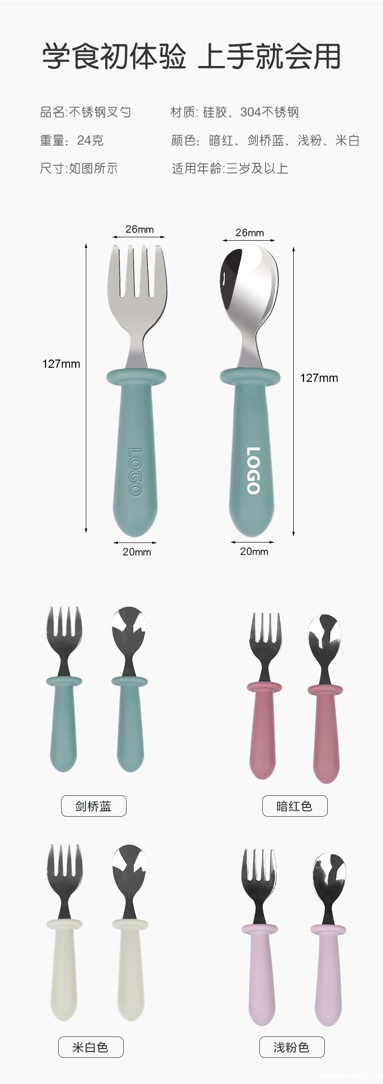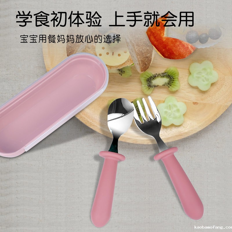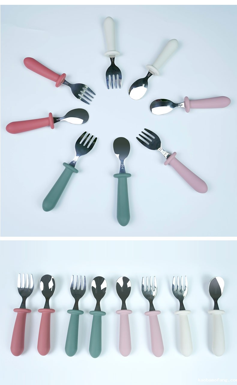 儿童不锈钢餐勺 硅胶手柄宝宝吃饭短柄叉勺 宝宝叉勺套装餐具