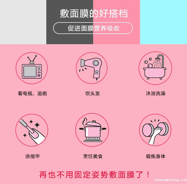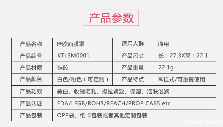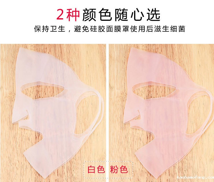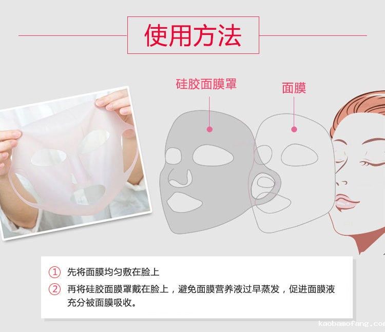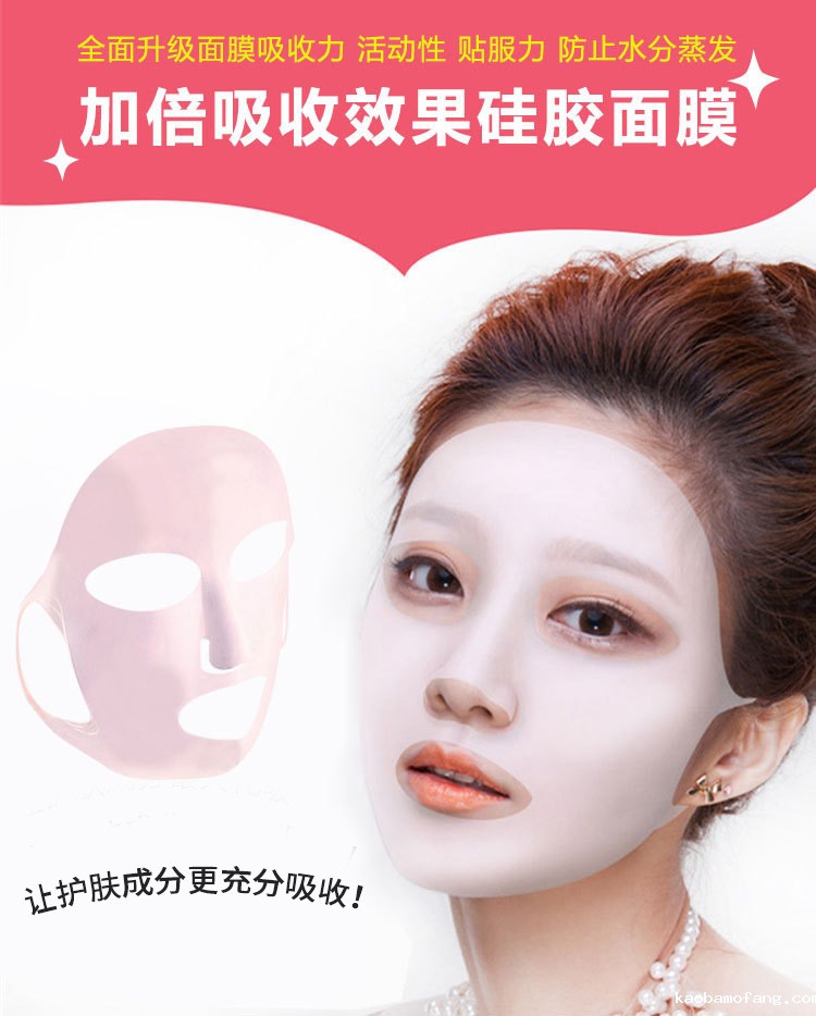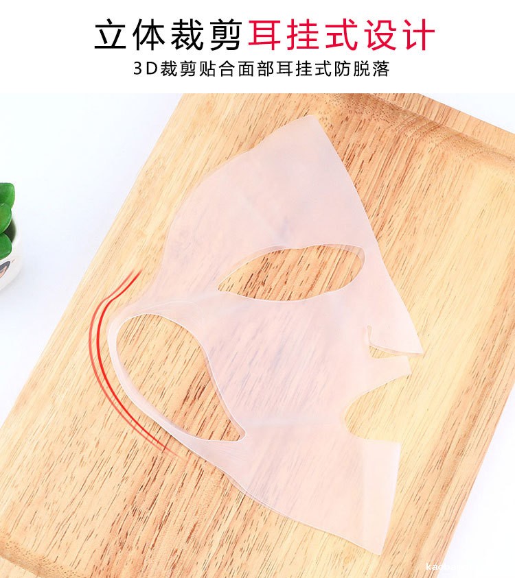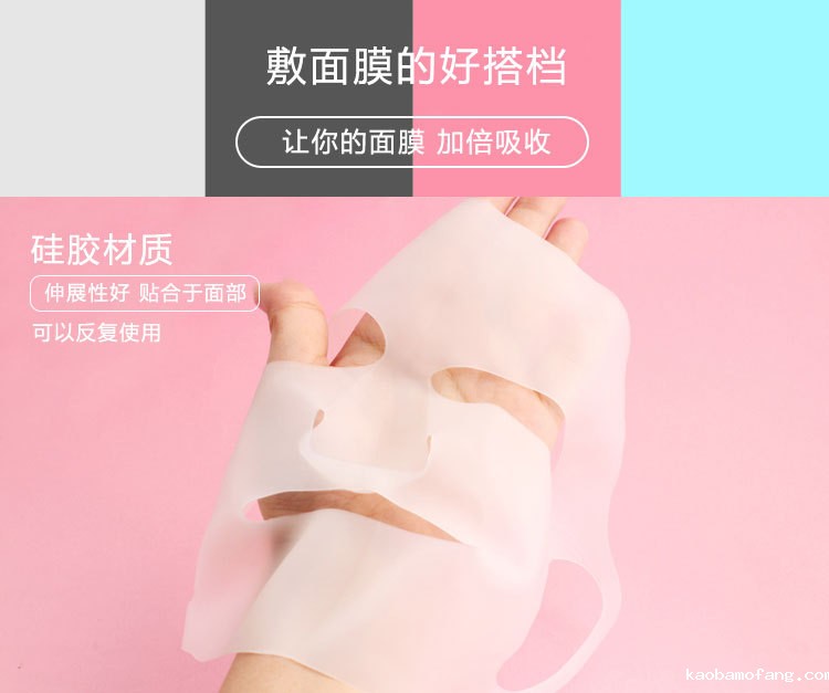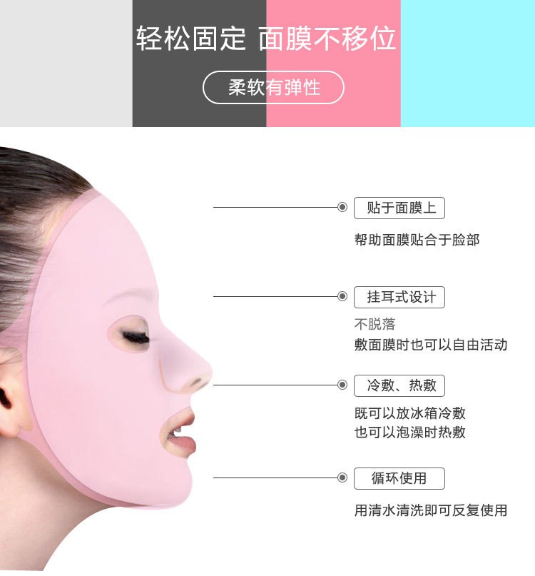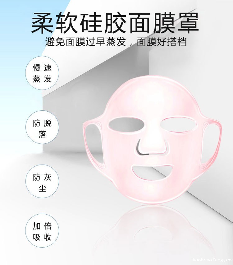 特点:环保硅胶材质,反复清洗使用,伸展性良好,贴合脸部有效防止面膜精华和水分过早蒸发,影响吸收;面膜罩耳挂设计,有效防止面膜移位或脱落,适合各种脸型。