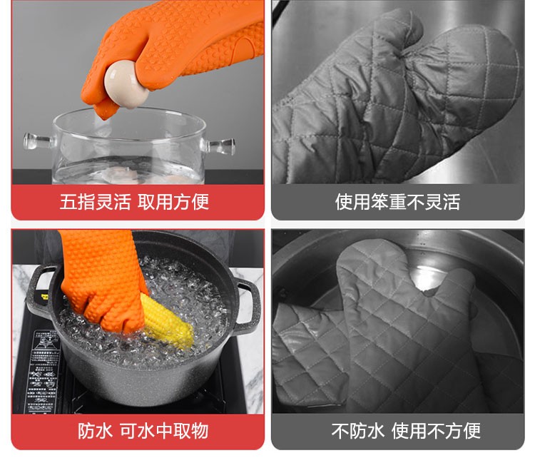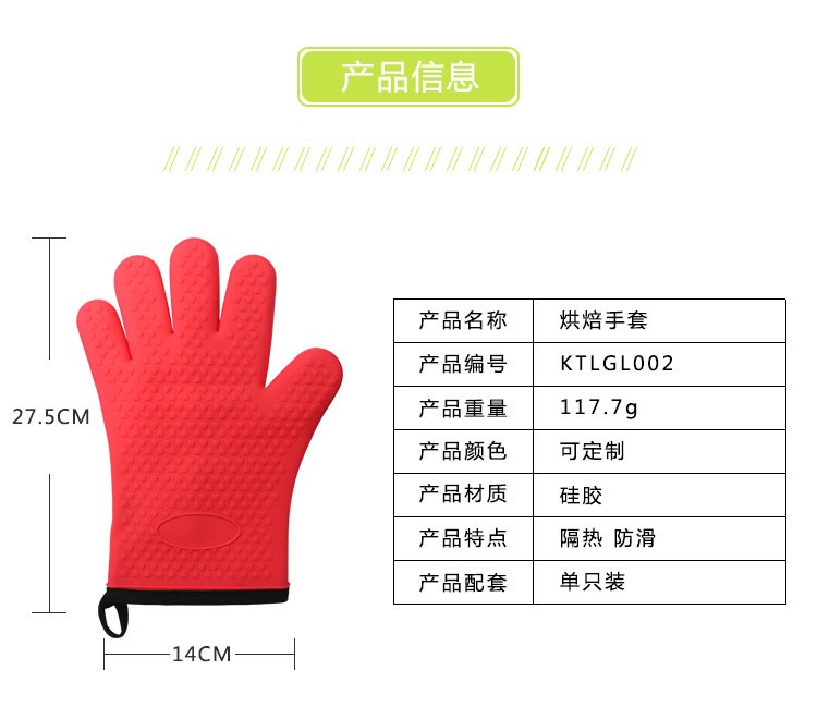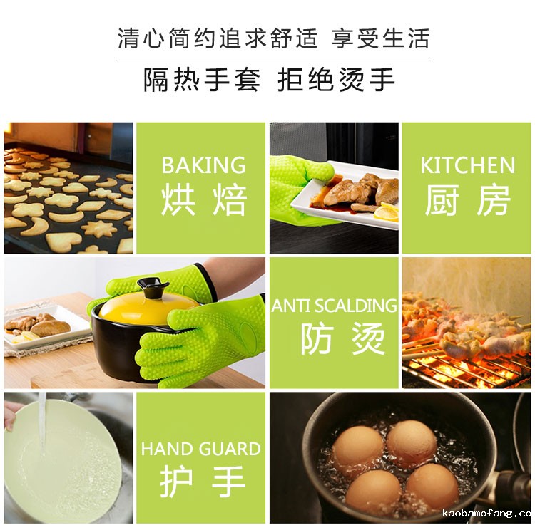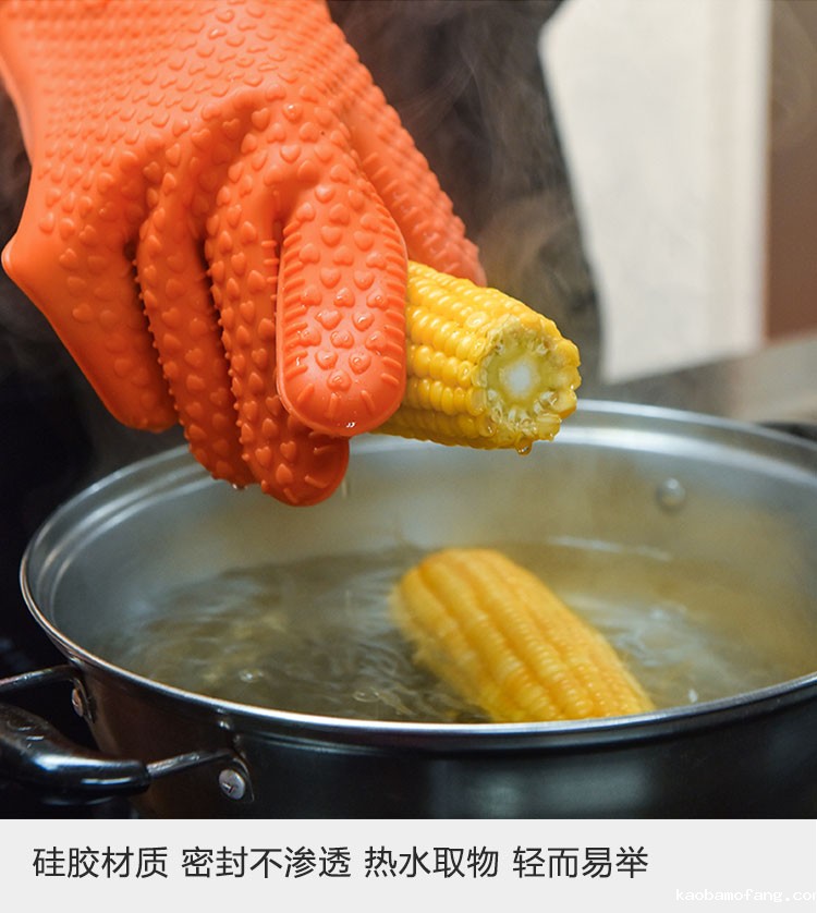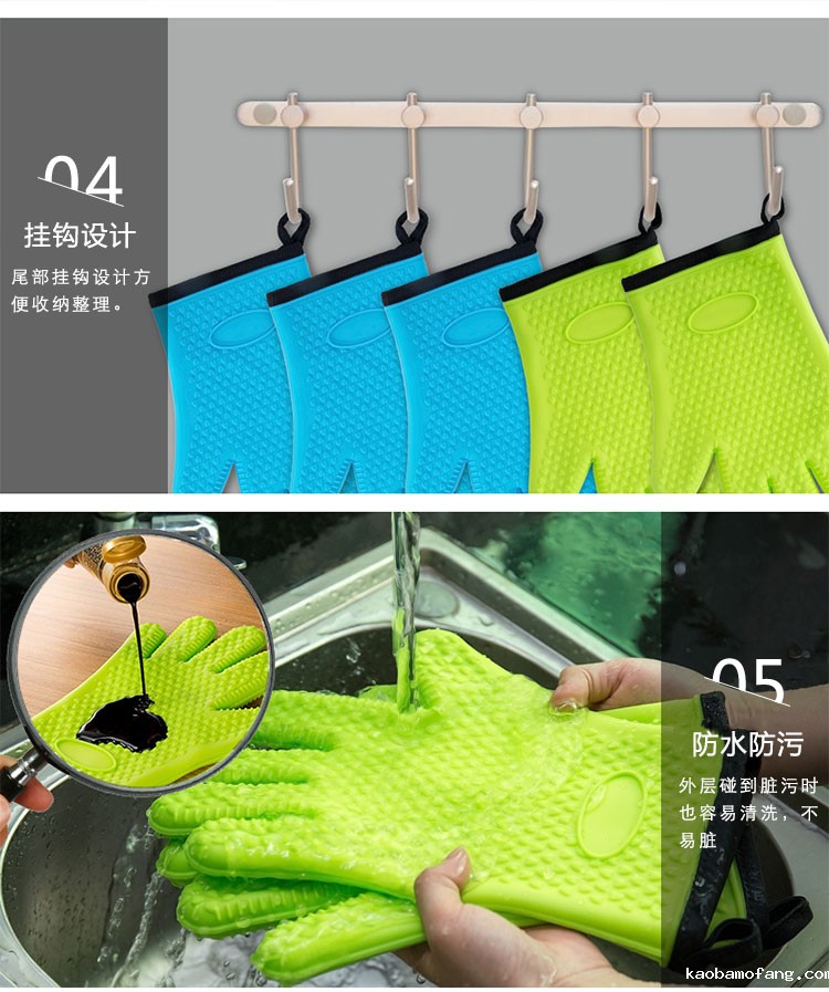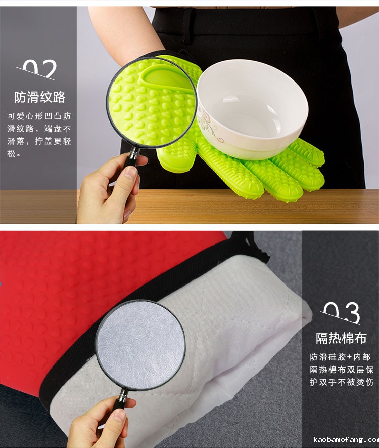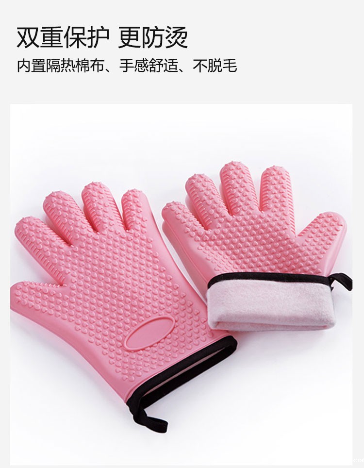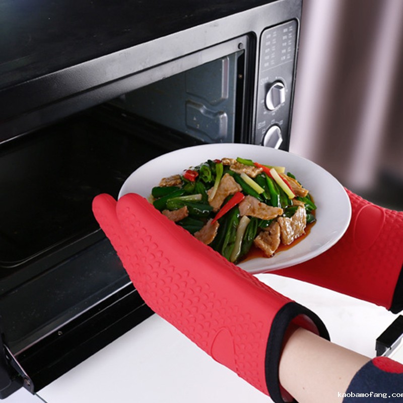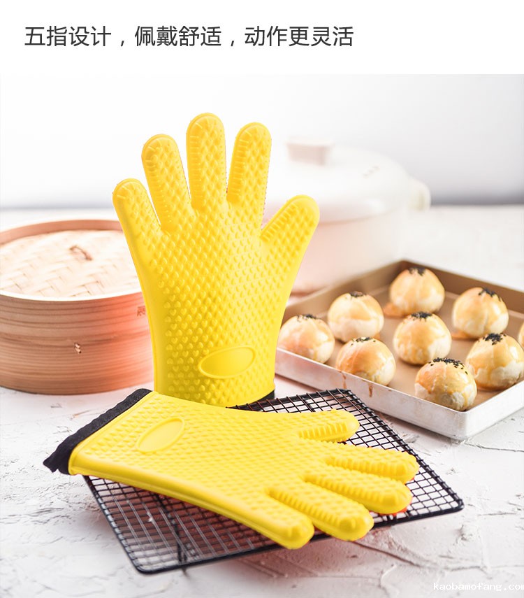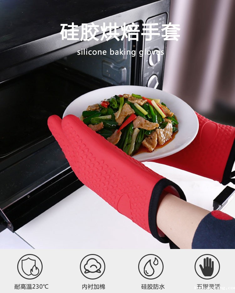 硅胶烘焙手套质地柔软,分指设计,防滑防脏,内置隔热棉,有效保护双手。